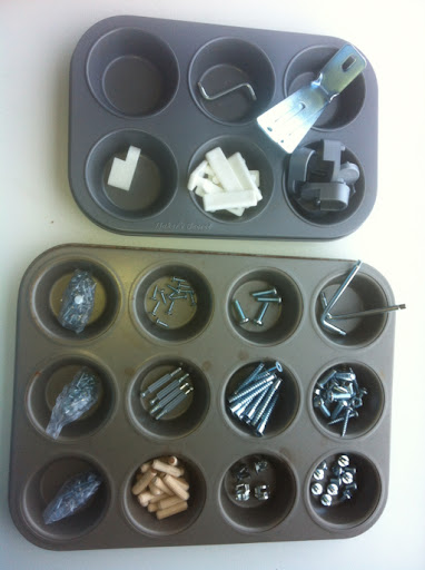 Before cracking open a beer and putting the tool belt (which is just for effect considering an Allen wrench is usually all that is needed) grab a muffin thinger to sort and count all the pieces. It makes getting to the pieces you need faster and helps keep count to make sure you are on target to finish with no pieces needed or left over.